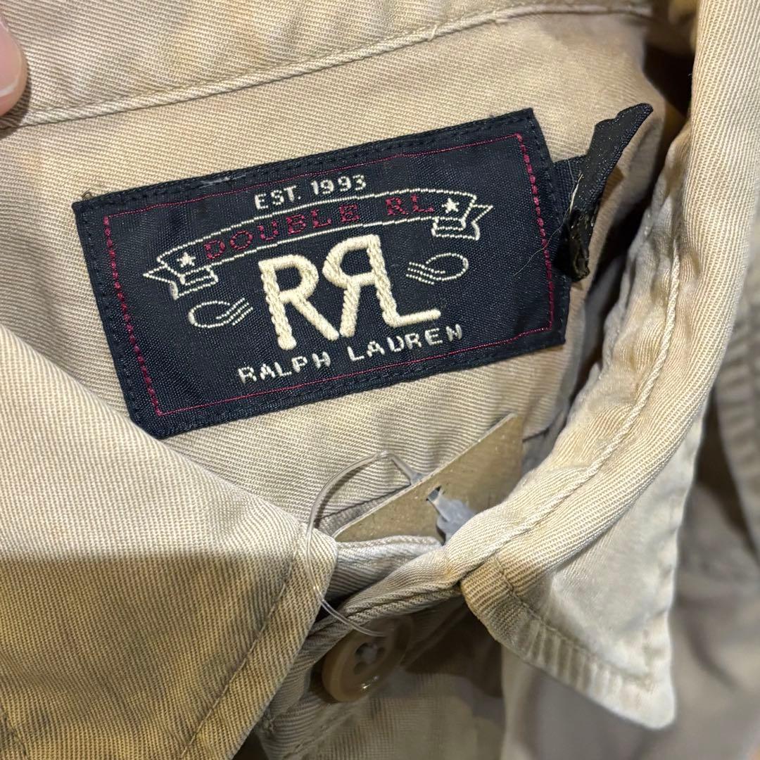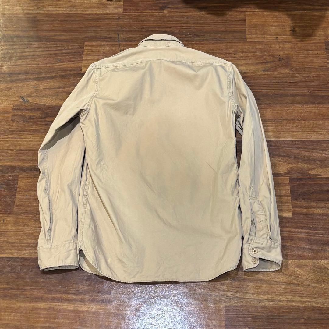 ベージュのコットン製長袖シャツ、フロントポケット付き。