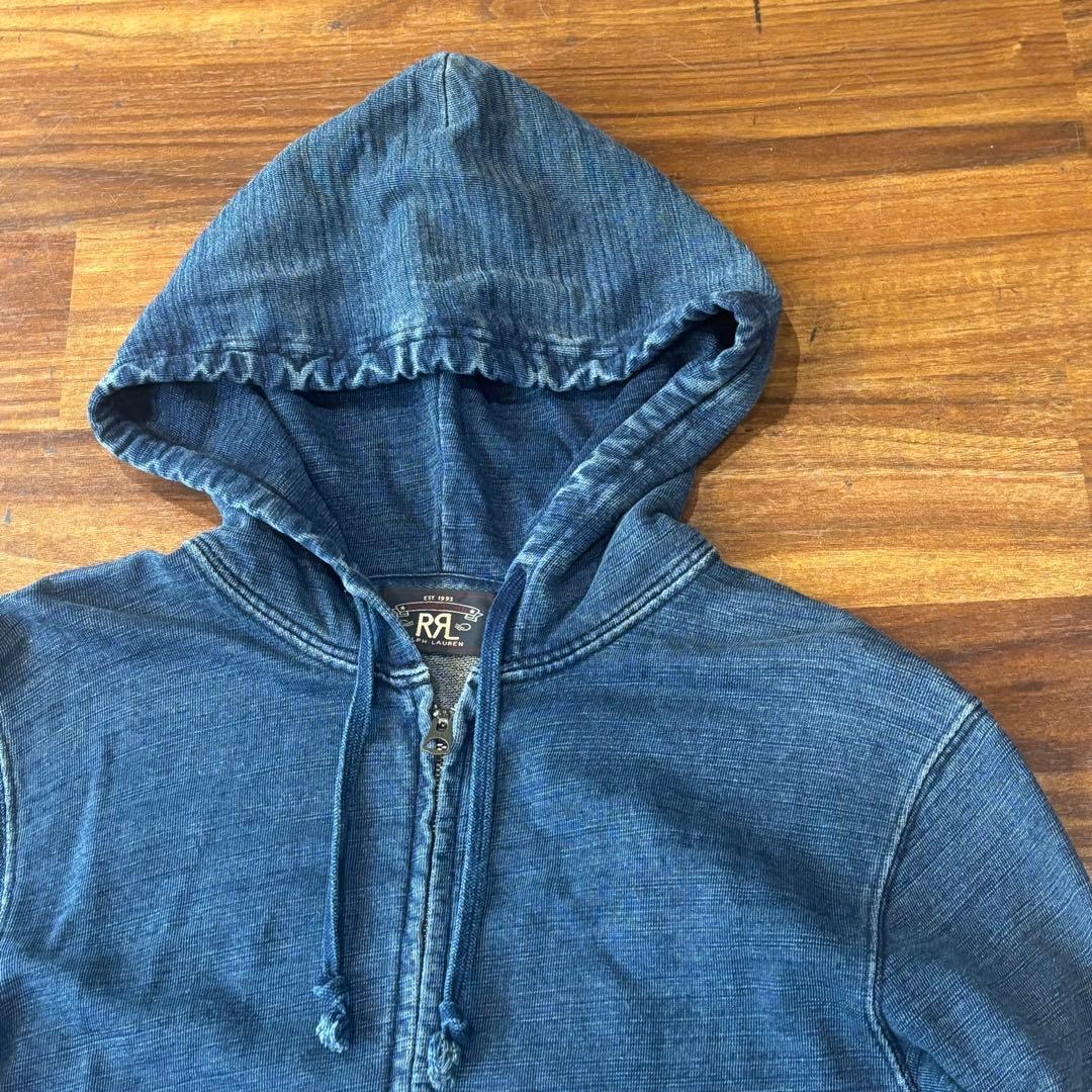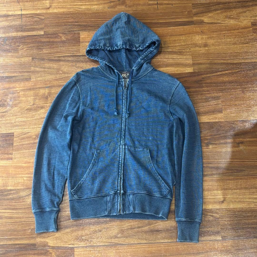 ダークブルーのフルジップパーカー、フード付きでカジュアルなスタイルに最適。