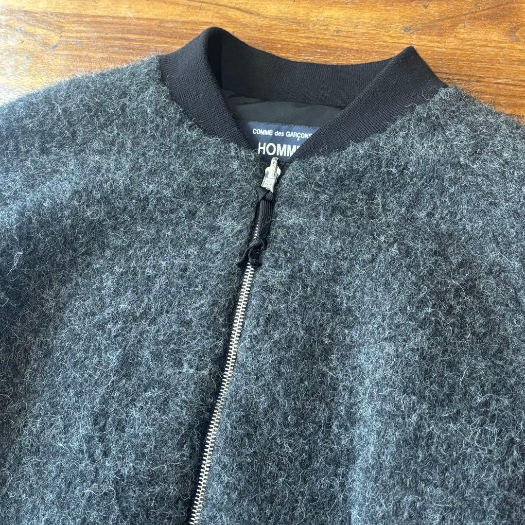 コムデギャルソンオムのフリース素材のグレーのボンバージャケット、フロントジッパーとポケット付き。