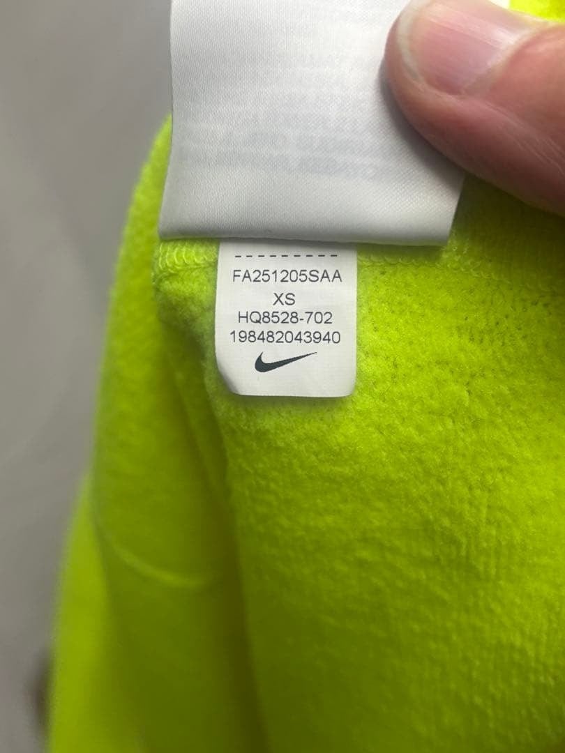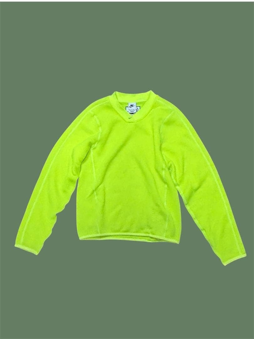蛍光イエローのNike製長袖カットソー、フリース素材で快適な着心地。